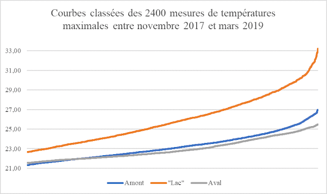 Pour les valeurs maximales, le plan d'eau présente une eau plus chaude de près de 6,5 degrés comparé au cours d'eau !