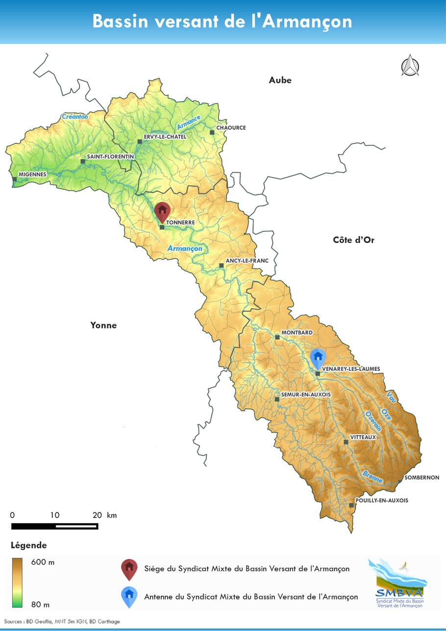 L'Armançon confluant dans l'Yonne à Migennes, le bassin versant de l'Armançon est la surface sur laquelle toute goutte de pluie se retrouvera par ruissellement dans l'Armançon avant la confluence.